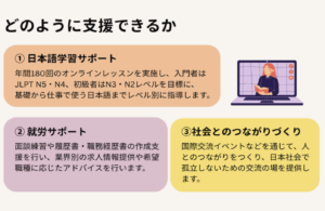 主な活動内容: 在住外国人向け日本語教育、就労支援、国際交流イベントの企画・運営