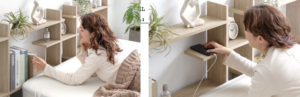 また、もう一つのこだわりとして、宮棚の奥行きです。現代の生活で、別途サイドに置く物、第一位はスマートフォンです。スマートフォンの充電をしながら就寝前に操作したり、目覚まし時計の代わりにスマートフォンを利用する方も多いと思います。そこでスマートフォンを置いても落ちない、でも取りやすい絶妙な奥行きにしたいという気持ちから何度もスマートフォンを置いて試し、最適な奥行きを追求しました。