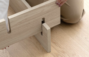 開発のきっかけは、工場から届いたサンプルのベッドを組み立てている光景でした。電動ドライバーを手に何十本ものネジを一つ一つ締めていく作業。時間はかかるし、力も必要。「この作業をもっと簡単にできないだろうか?」と思い、市場調査をすると、確かにネジを使わないベッドは存在しています。しかし、どれもフレーム単体で宮棚は別売りだったり、取り付けるにはネジが必要だったりと、宮棚まで含めてネジを使わないベッドはありませんでした。本製品の開発にあたり、最大の難関は『ネジを使わずに宮棚を固定すること』でした。宮棚には、スマートフォン、目覚まし時計、眼鏡、本など様々な物を置かれと思います。その為、当然強度が求められ、どうやったら十分な強度を確保できるのかというところを考え、特に宮棚とフレーム接合部分に気を使い、何度も図面を引き直し、はめ込みの角度や深さ、接触面積を調整しました。