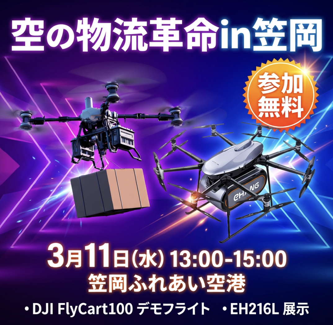 一般社団法人日本ドローンビジネスサポート協会は、2026 年 3 月 11 日(水)に岡山県 笠岡市の笠岡ふれあい空港にて、「空の物流革命 in 笠岡」を開催いたします。DJI 社製の 物流用大型ドローン「FlyCart 100」(80kg 積載)の実機デモフライト、EHang 社製の 物流用 eVTOL「EH216L」(250kg 積載)の機体展示、能登半島地震での災害活用報告 を実施します。EH216L の展示は石川県以外では初。参加費無料。