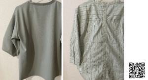 乾燥機使用後の「ラクドライ」(左写真)と、従来品の綿混シャツ(右写真) ※QRコード:実験動画
